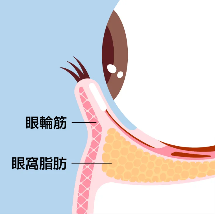 通常、眼輪筋がしっかりと張っているため、眼窩脂肪は眼底に安定して収まり、ズレることがありません。