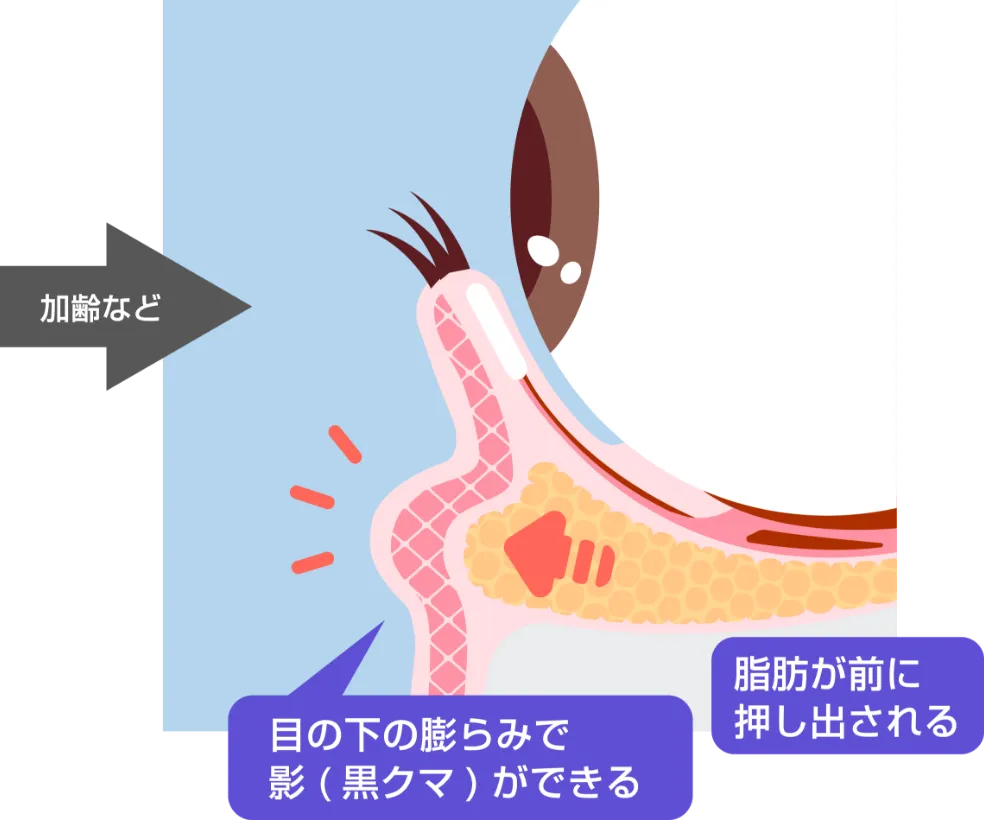 加齢により眼輪筋が衰え、脂肪を支える力が弱くなることで、眼窩脂肪が前に押し出されてしまいます。 また重力により負荷がかかり眼窩脂肪が突出することも原因となります。